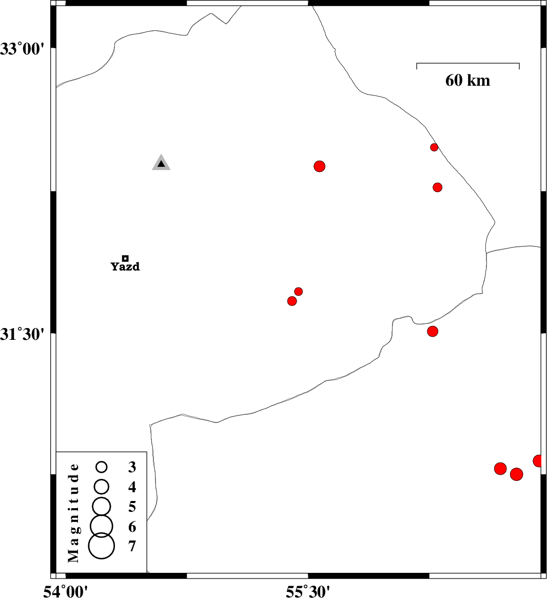 | 2015/02/19 | 10:49:09.8 | 14:19:09.8 | 31.72 | 55.44 | 6 | ML2.3 | Yazd Province, 14 km North of Bafq | ||