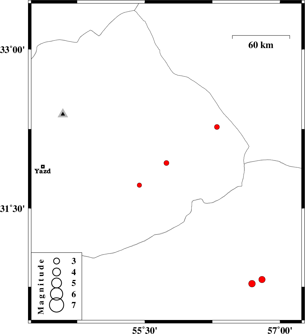 | 2015/02/19 | 10:49:09.8 | 14:19:09.8 | 31.72 | 55.44 | 6 | ML2.3 | Yazd Province, 14 km North of Bafq | ||