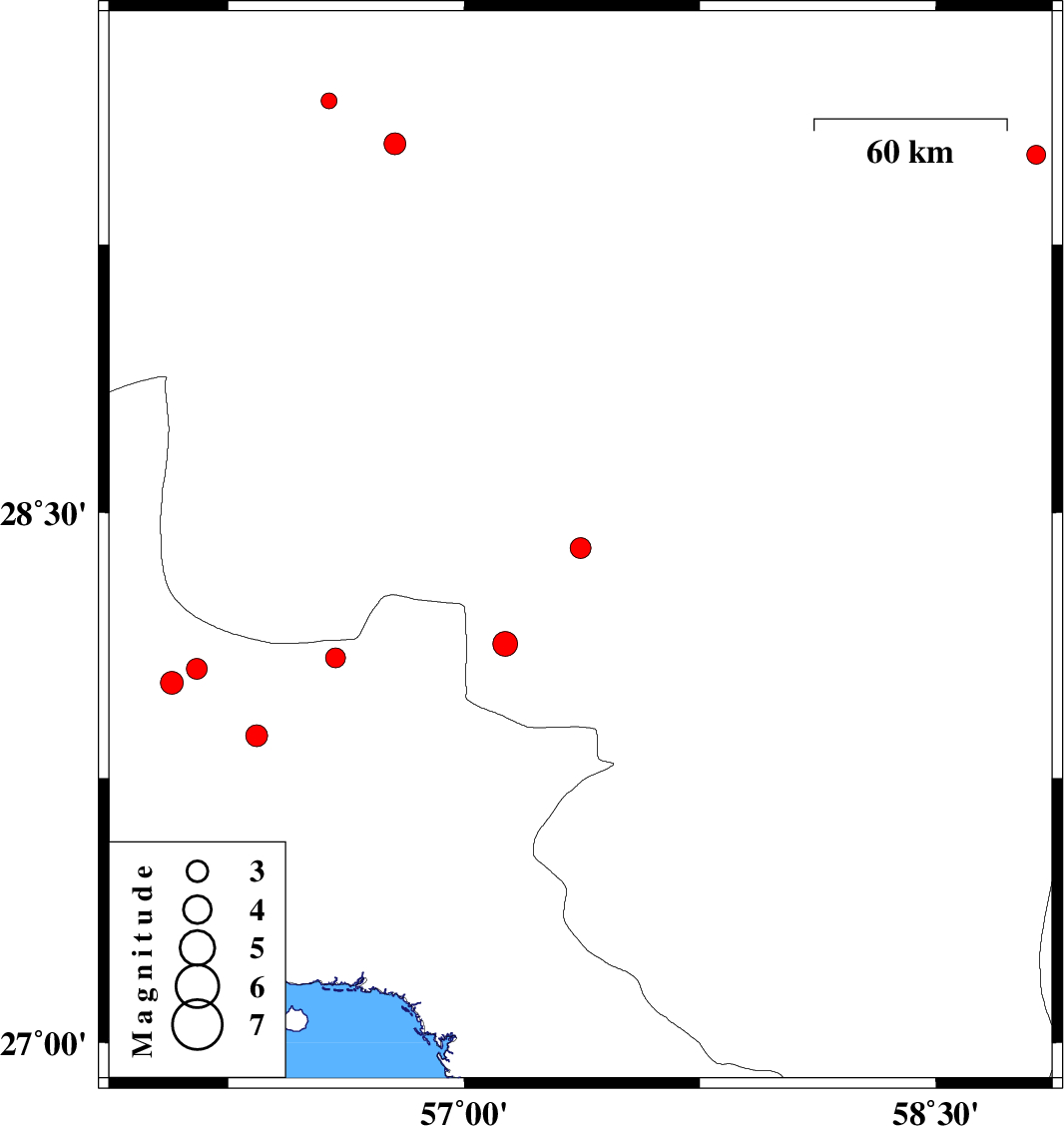 | 2015/02/10 | 18:49:50.4 | 22:19:50.4 | 28.13 | 57.13 | 6 | ML3.5 | Kerman Province, 59 km North-West of Kahnuj | ||