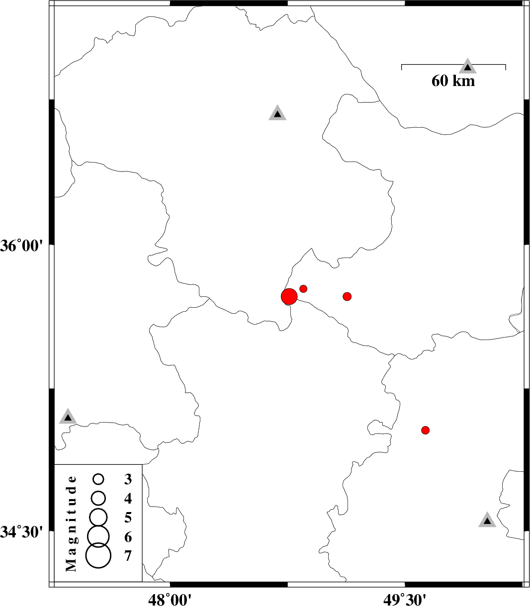 2015/03/02 | 06:08:41.3 | 09:38:41.3 | 35.73 | 48.76 | 17 | ML4.6 | Hamedan Province, 57 km North of Kabudar Ahang | ||