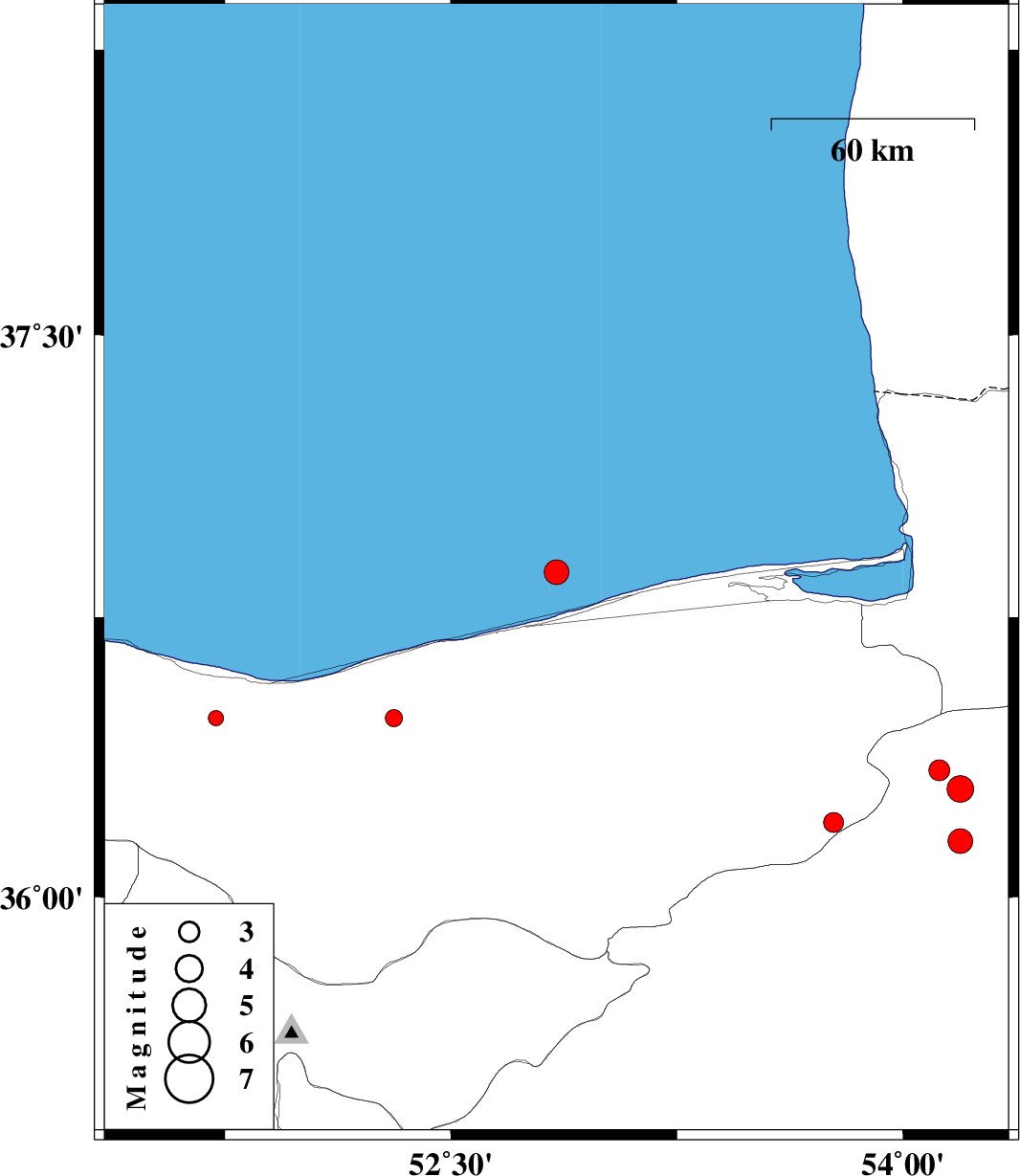 2015/03/02 | 22:38:37.3 | 02:08:37.3 | 36.87 | 52.85 | 14 | ML3.6 | Caspian Sea, 26 km North of Joybar | ||