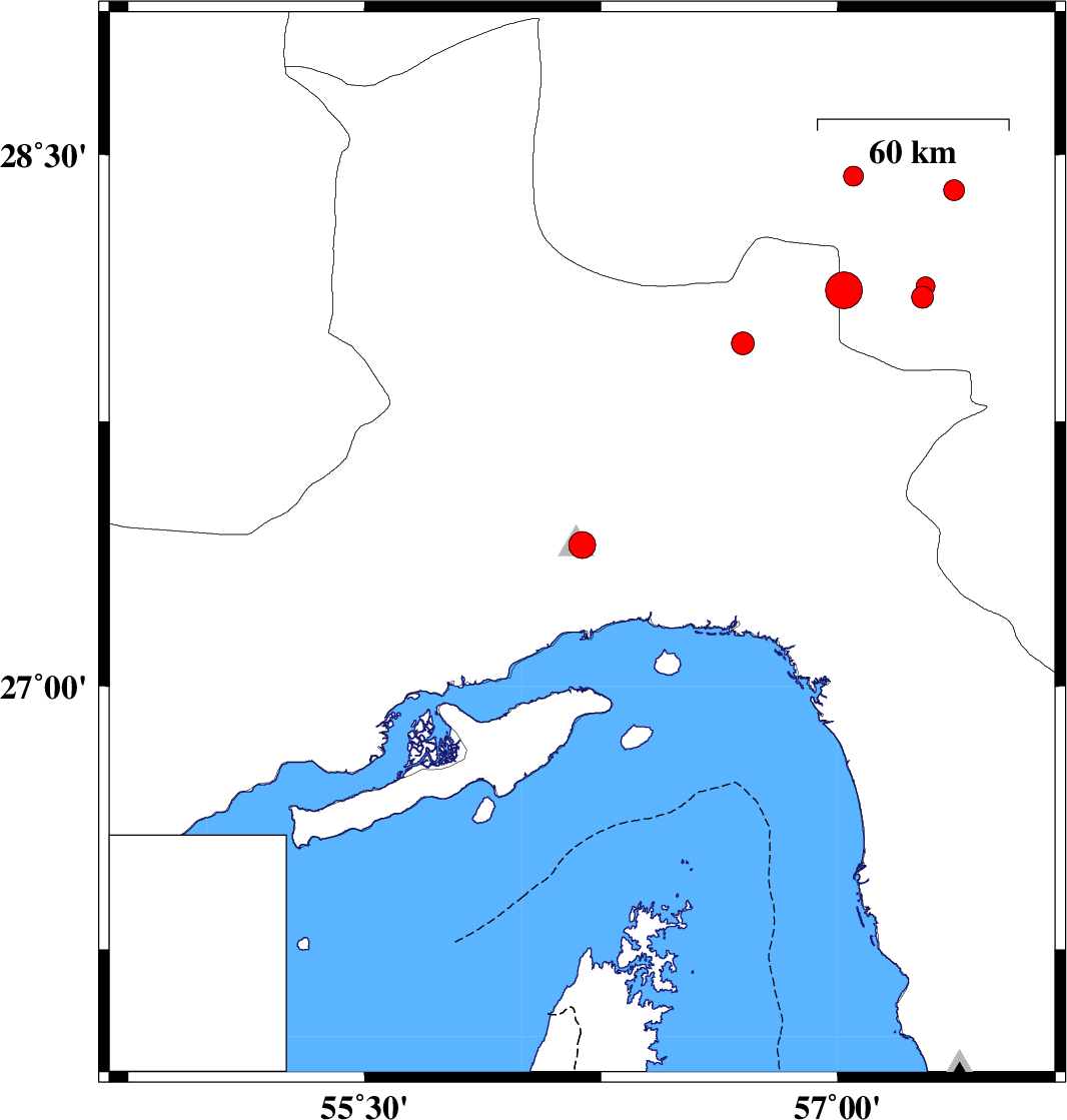 | 2015/03/05 | 11:23:06.1 | 14:53:06.1 | 28.13 | 57.28 | 34 | ML2.7 | Kerman Province, 45 km North-West of Kahnuj | ||