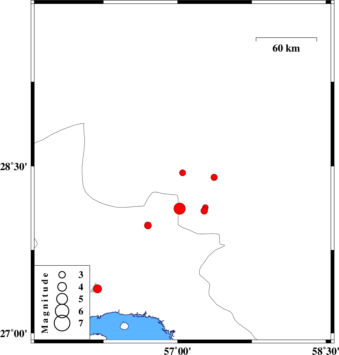| 2015/03/05 | 11:23:06.1 | 14:53:06.1 | 28.13 | 57.28 | 34 | ML2.7 | Kerman Province, 45 km North-West of Kahnuj | ||