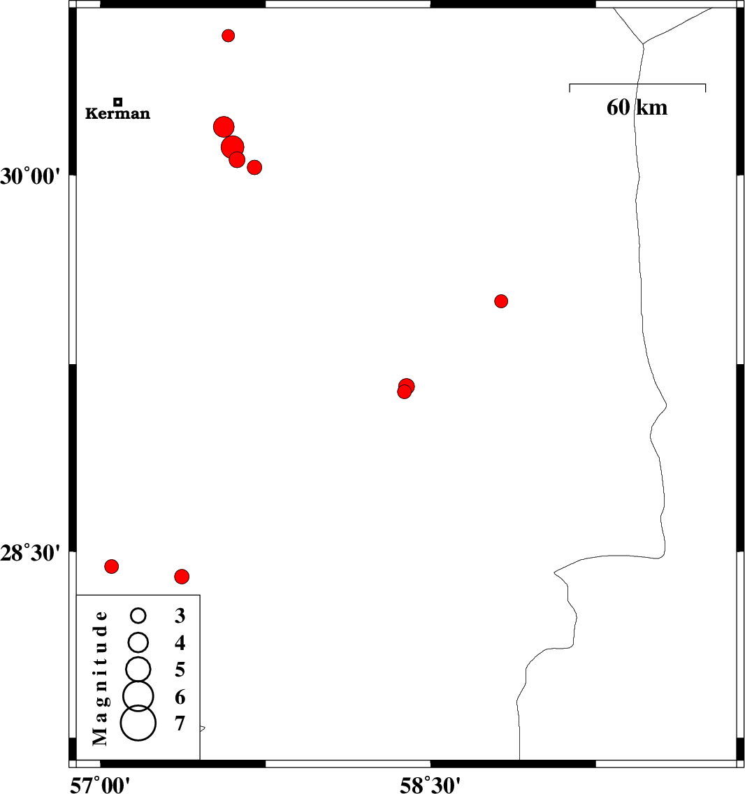 | 2015/02/04 | 02:18:35.7 | 05:48:35.7 | 30.03 | 57.7 | 16 | ML3 | Kerman Province, 66 km South-East of Kerman |