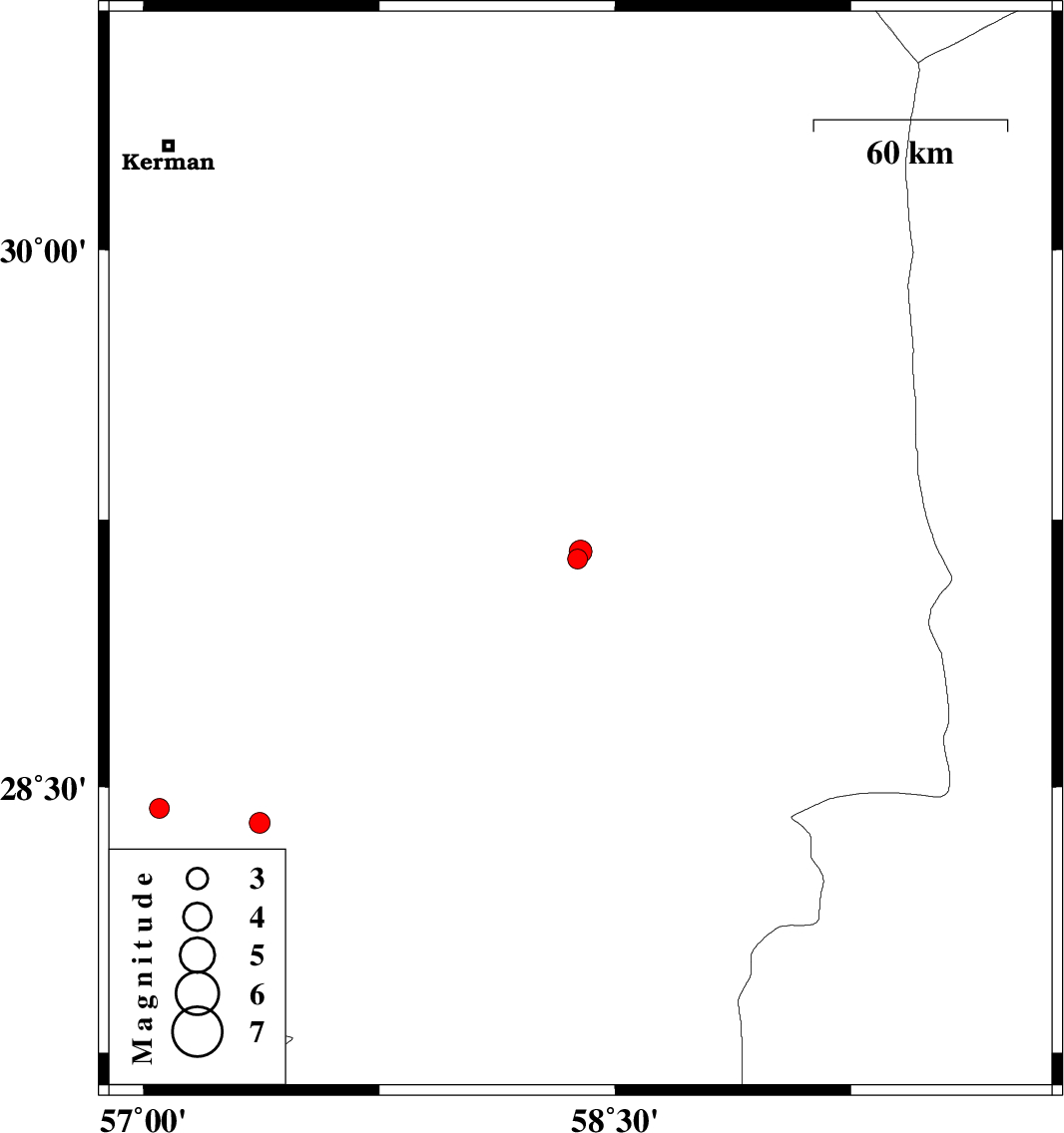 | 2015/02/28 | 01:18:55.3 | 04:48:55.3 | 28.4 | 57.37 | 14 | ML2.9 | Kerman Province, 47 km South-West of Jiroft |