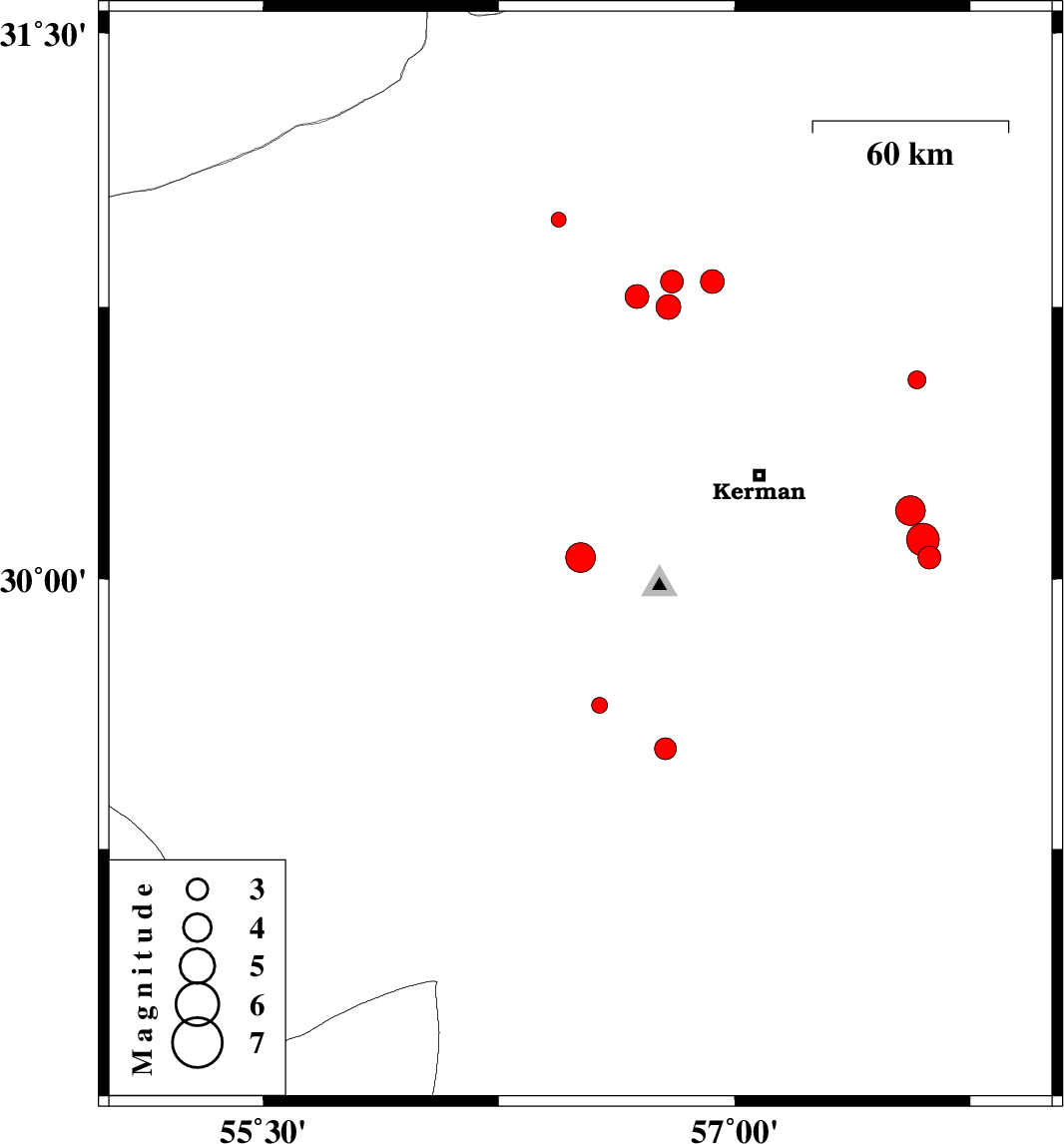 | 2015/02/07 | 00:42:21.5 | 04:12:21.5 | 29.65 | 56.57 | 14 | ML2.3 | Kerman Province, 31 km South of Bardsir |
