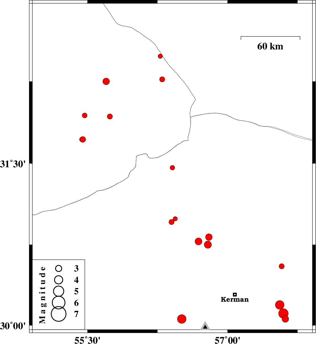 | 2015/02/22 | 15:20:20.8 | 18:50:20.8 | 30.55 | 57.58 | 17 | ML2.6 | Kerman Province, 56 km North-East of Kerman | ||