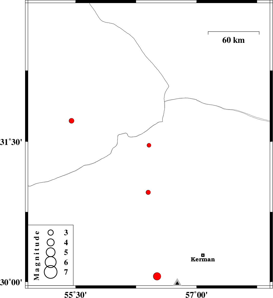 | 2015/03/08 | 18:43:33.1 | 22:13:33.1 | 30.06 | 56.51 | 14 | ML4.3 | Kerman Province, 16 km North of Bardsir |