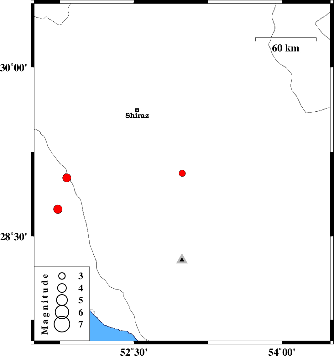| 2015/02/19 | 05:35:19.4 | 09:05:19.4 | 28.74 | 51.73 | 38 | ML3.9 | Bushehr Province, 37 km East of Khormog |