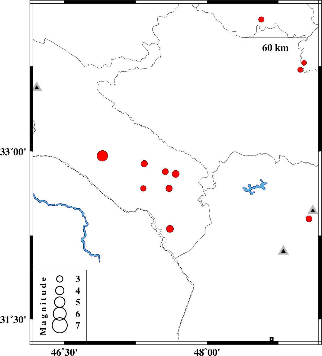 | 2015/03/01 | 02:43:54.5 | 06:13:54.5 | 32.82 | 47.56 | 14 | ML3 | Ilam Province, 14 km South of Abdanan | ||