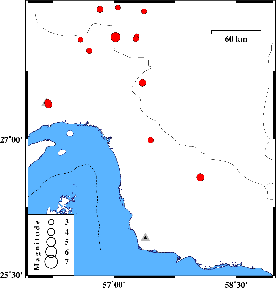 | 2015/03/10 | 21:32:27.3 | 01:02:27.3 | 26.58 | 58.06 | 14 | ML4.2 | Hormozgan Province, 110 km North-East of Jask | ||