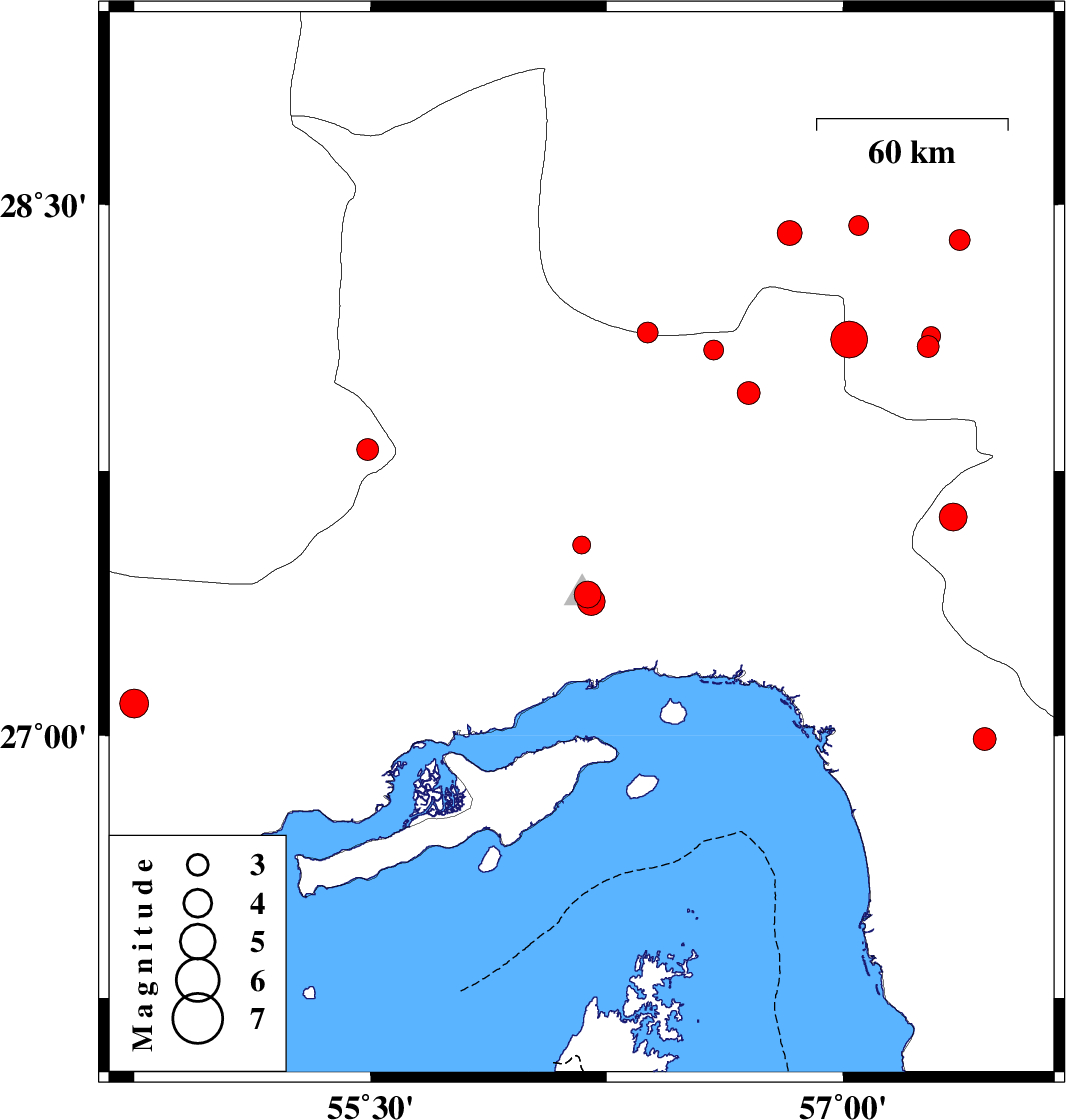 | 2015/03/05 | 11:23:06.1 | 14:53:06.1 | 28.13 | 57.28 | 34 | ML2.7 | Kerman Province, 45 km North-West of Kahnuj | ||