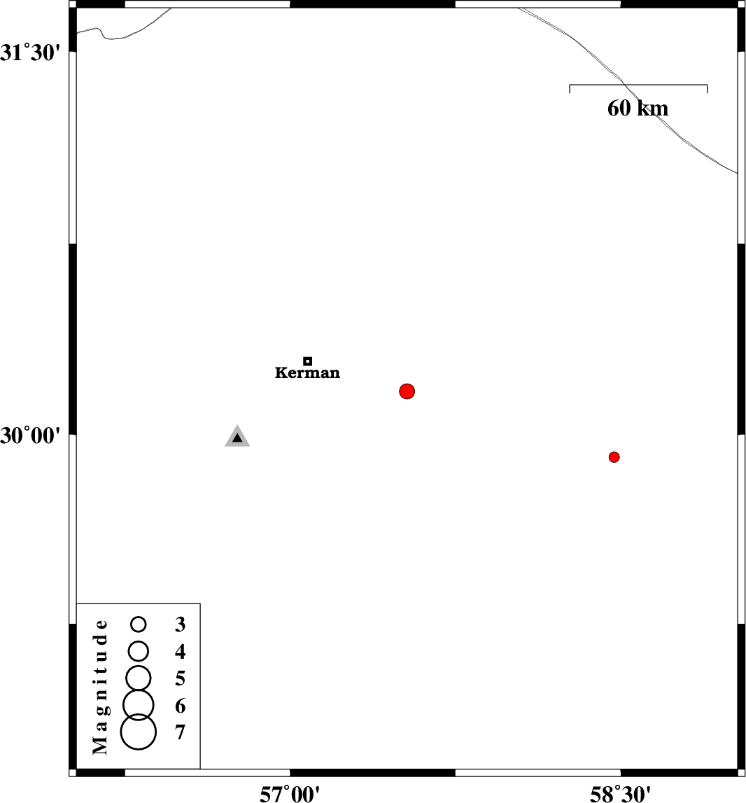 | 2015/03/18 | 06:34:09.7 | 10:04:09.7 | 29.91 | 58.47 | 18 | ML2.1 | Kerman Province, 90 km North-East of Bam |