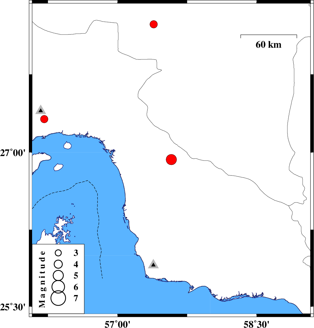 | 2015/03/29 | 04:16:16.1 | 08:46:16.1 | 26.93 | 57.58 | 15 | ML5.1 | Hormozgan Province, 54 km South of Manujan | ||