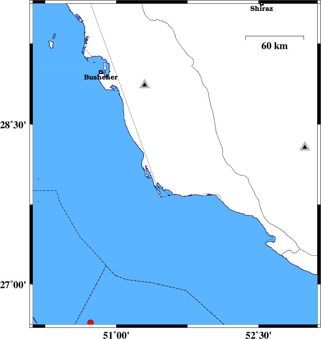 | 2015/04/03 | 13:09:06.6 | 17:39:06.6 | 28.7 | 51.17 | 8 | ML3.1 | Bushehr Province, 20 km West of Khormog | ||