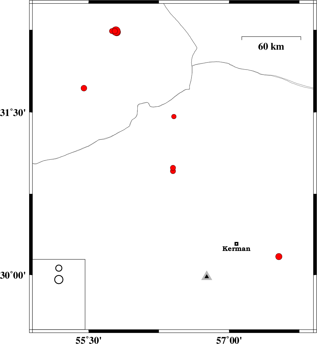 | 2015/03/09 | 13:51:23.4 | 17:21:23.4 | 30.96 | 56.4 | 18 | ML2.5 | Kerman Province, 23 km North-West of Zarand |