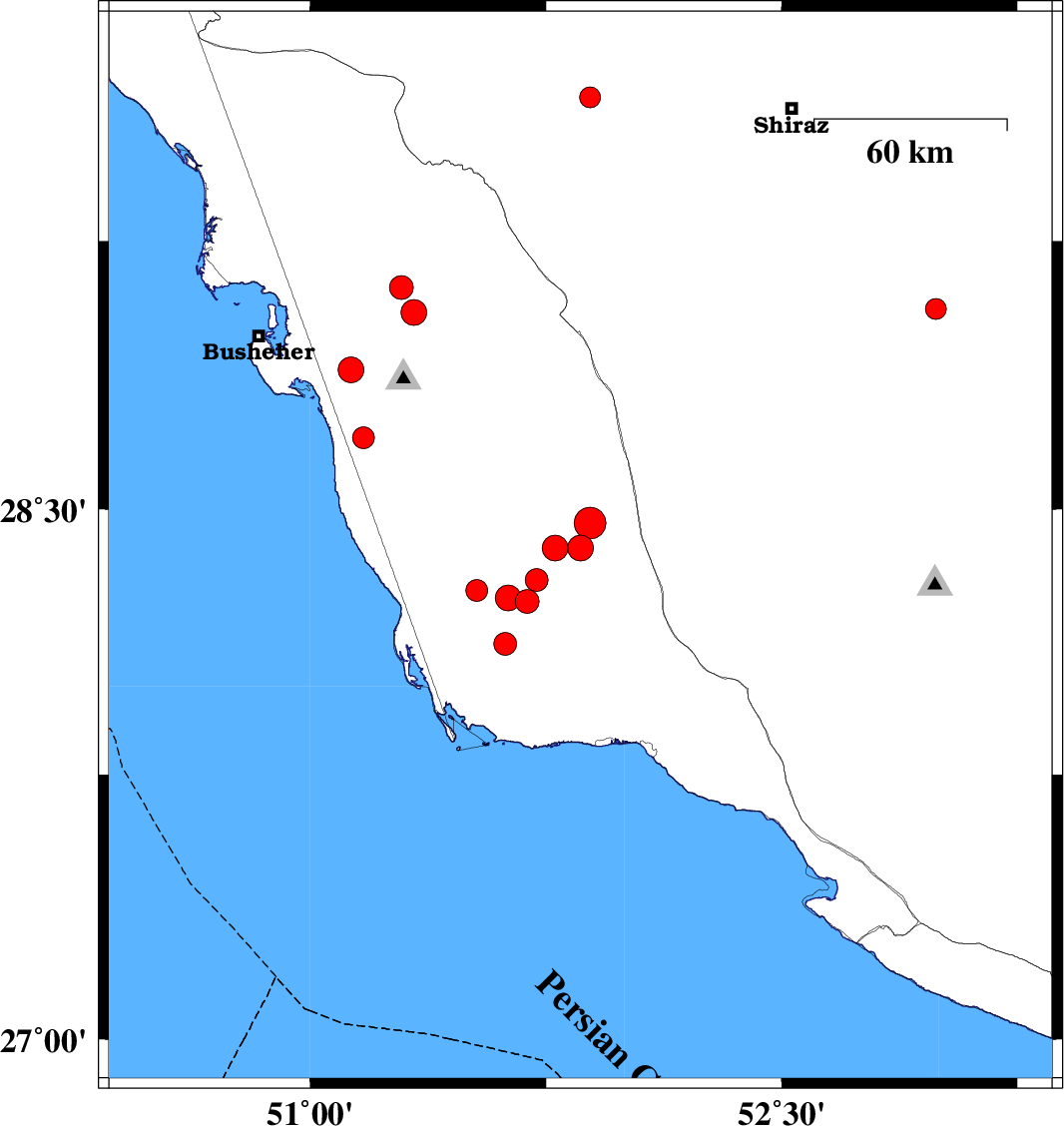 | 2015/04/10 | 10:13:46.3 | 14:43:46.3 | 28.39 | 51.86 | 15 | ML3.7 | Bushehr Province, 58 km South-West of Farashband | ||
