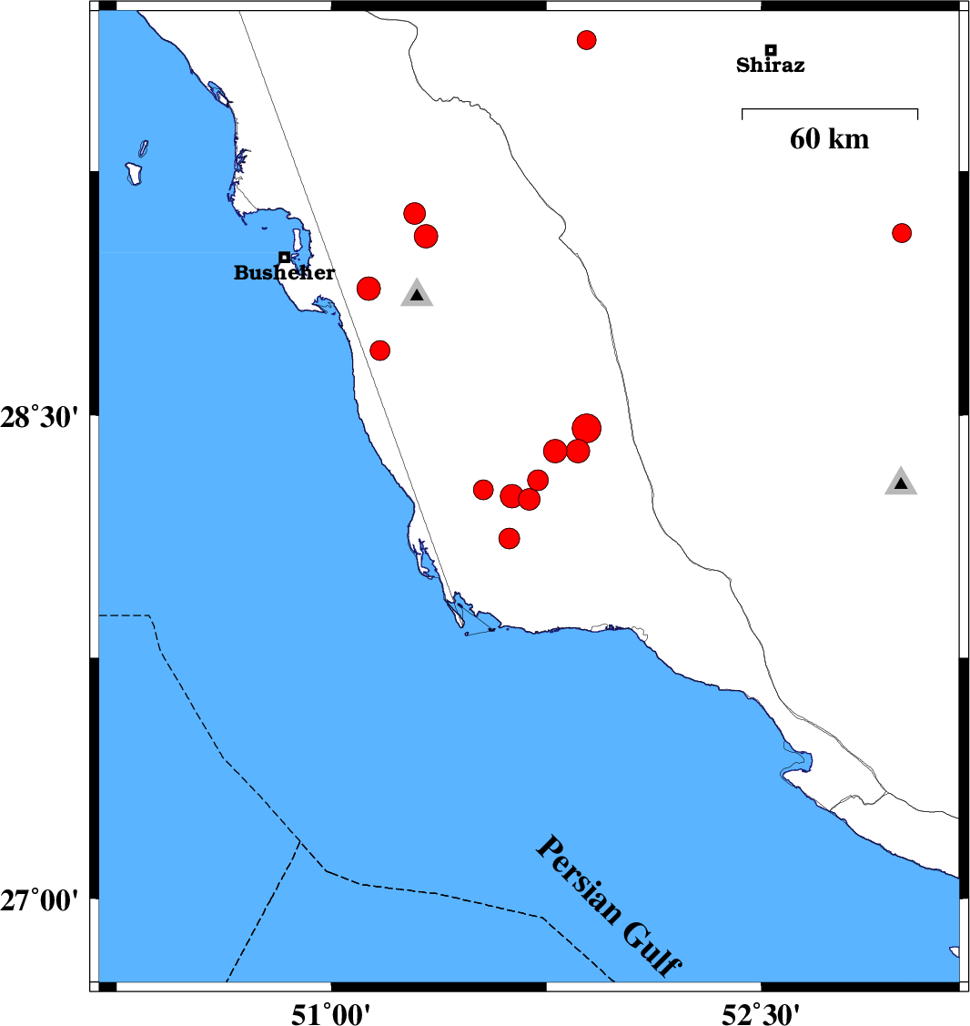 | 2015/04/06 | 03:24:08.8 | 07:54:08.8 | 28.89 | 51.13 | 4 | ML3.7 | Bushehr Province, 13 km West of Ahram | ||