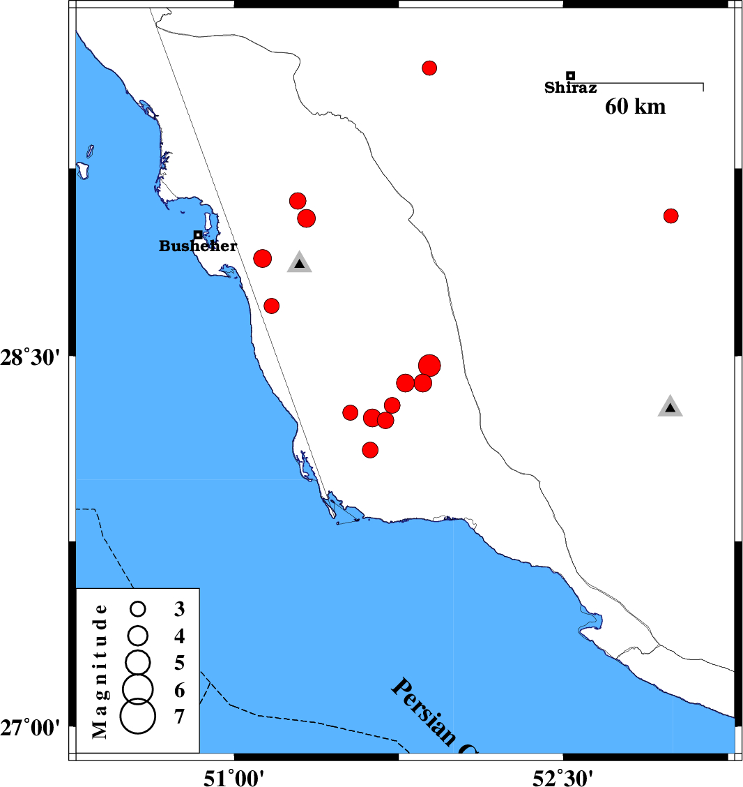 | 2015/04/10 | 10:13:46.3 | 14:43:46.3 | 28.39 | 51.86 | 15 | ML3.7 | Bushehr Province, 58 km South-West of Farashband | ||