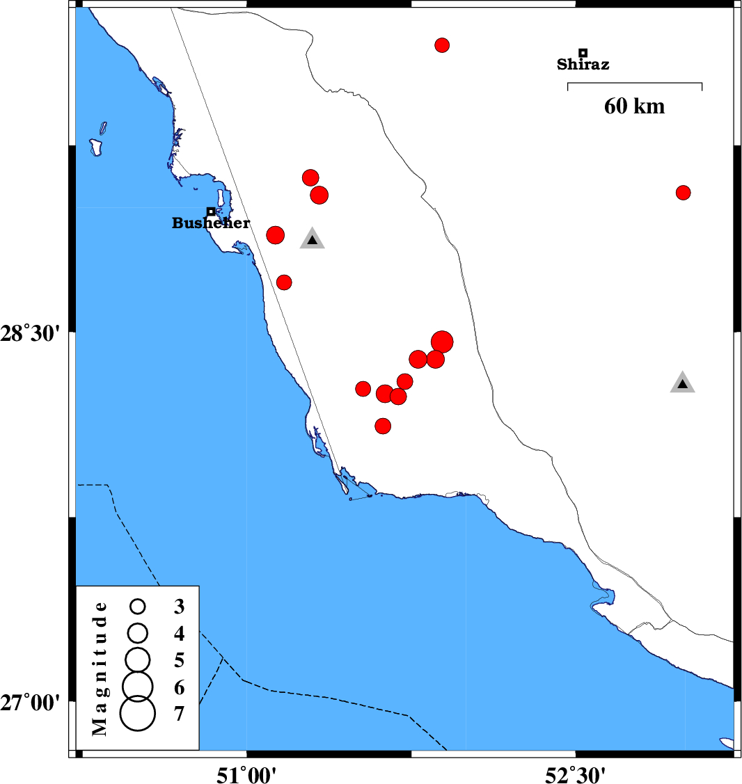 | 2015/04/05 | 05:03:57.7 | 09:33:57.7 | 29.12 | 51.29 | 7 | ML3.4 | Bushehr Province, 18 km South of Borazjan | ||