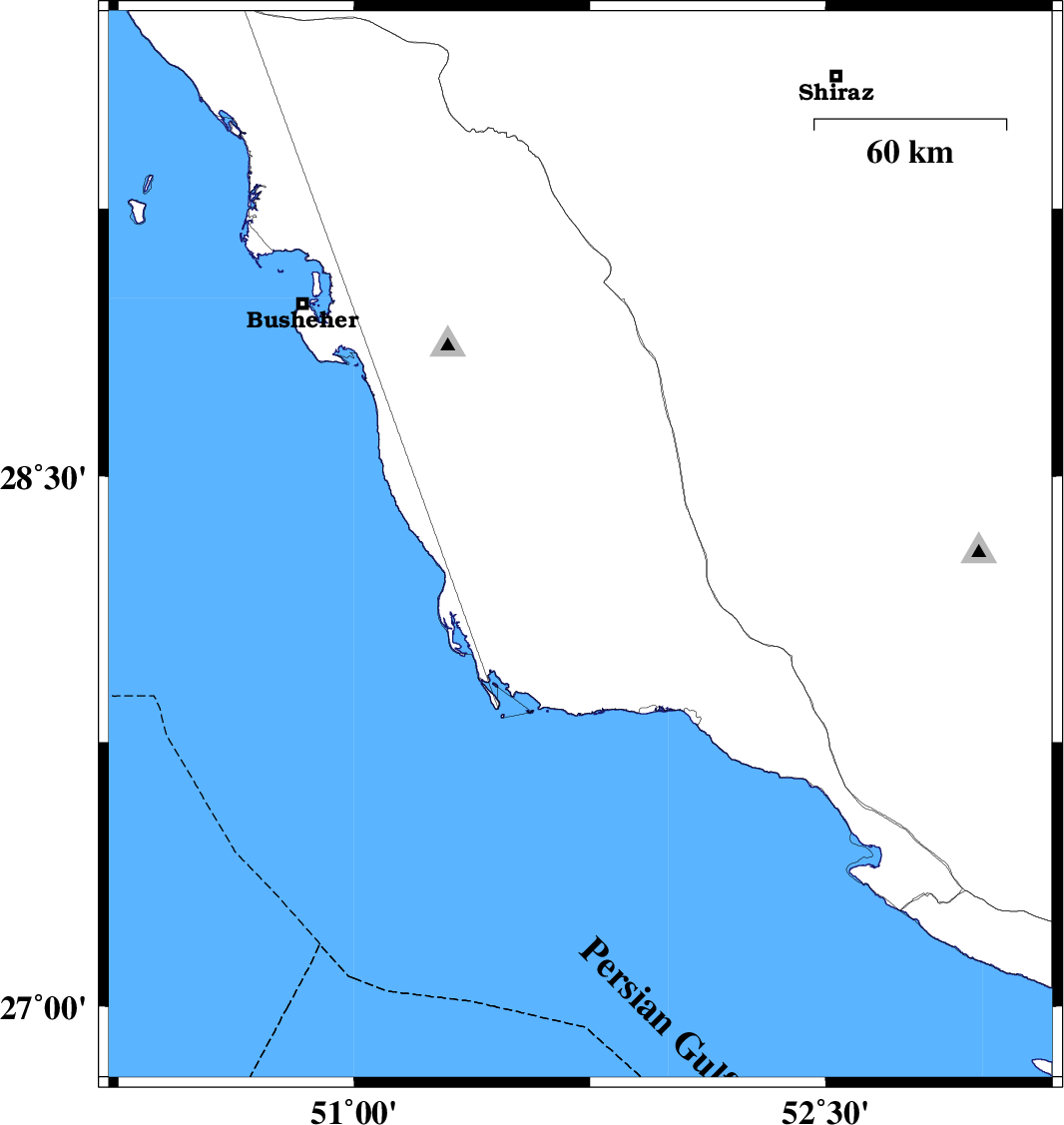 | 2015/04/09 | 02:48:03.1 | 07:18:03.1 | 28.25 | 51.63 | 43 | ML3.6 | Bushehr Province, 51 km South-East of Khormog | ||