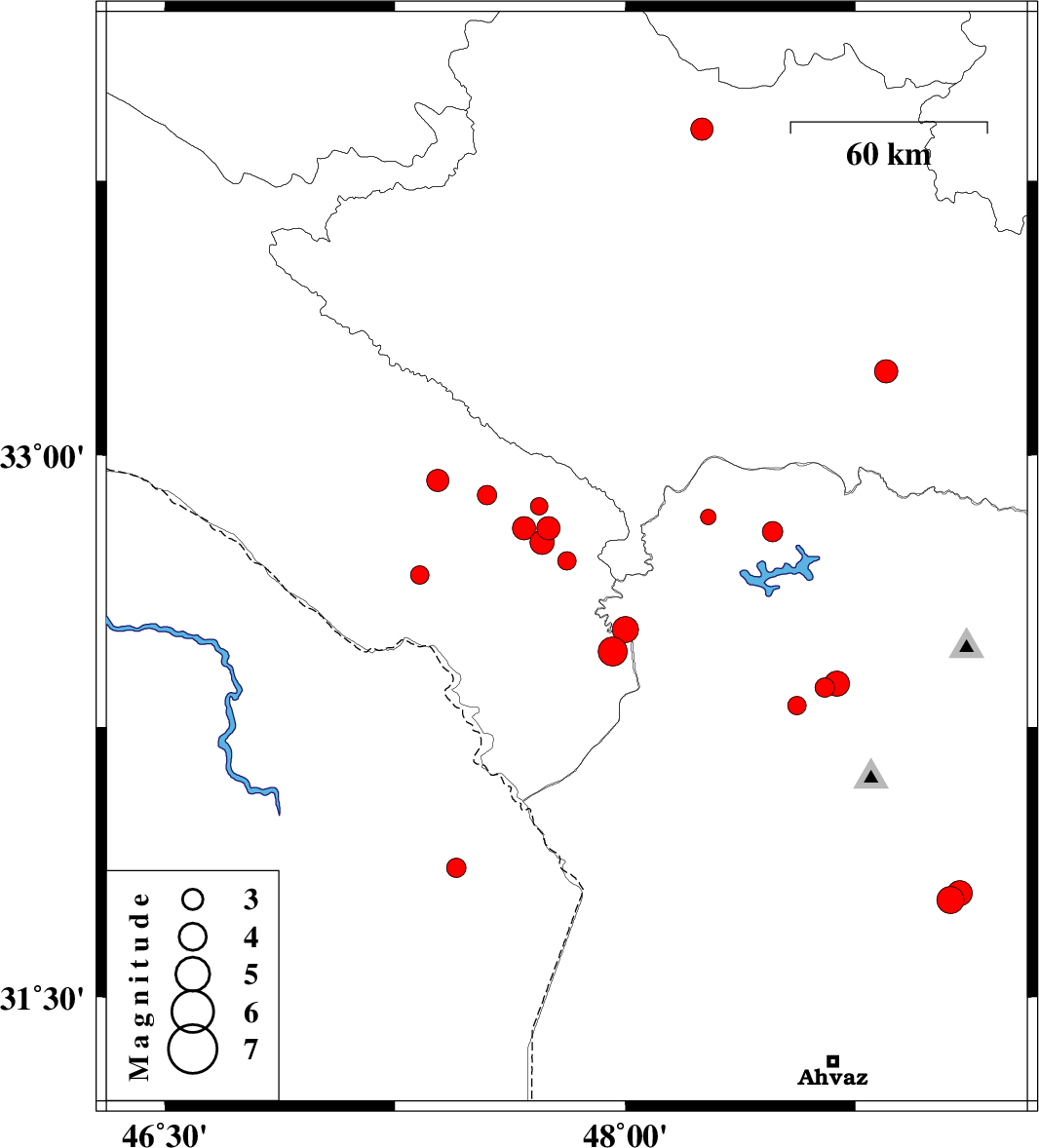 | 2015/03/25 | 11:05:59.6 | 15:35:59.6 | 31.79 | 49.09 | 14 | ML3.6 | Khoozestan Province, 26 km South-West of Masjed Soleyman | ||