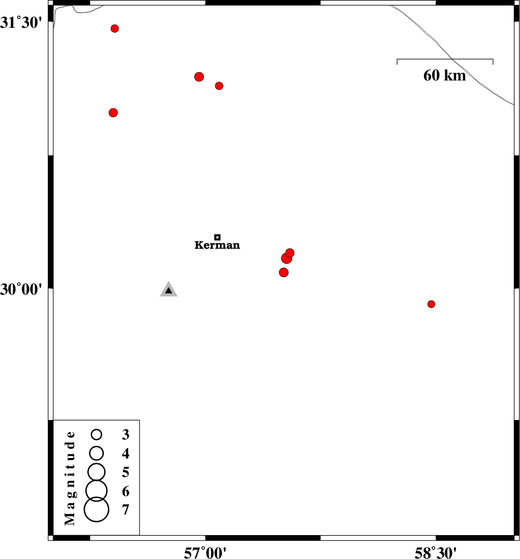 | 2015/04/12 | 06:58:30.9 | 11:28:30.9 | 30.2 | 57.55 | 14 | ML2.5 | Kerman Province, 47 km East of Kerman | ||