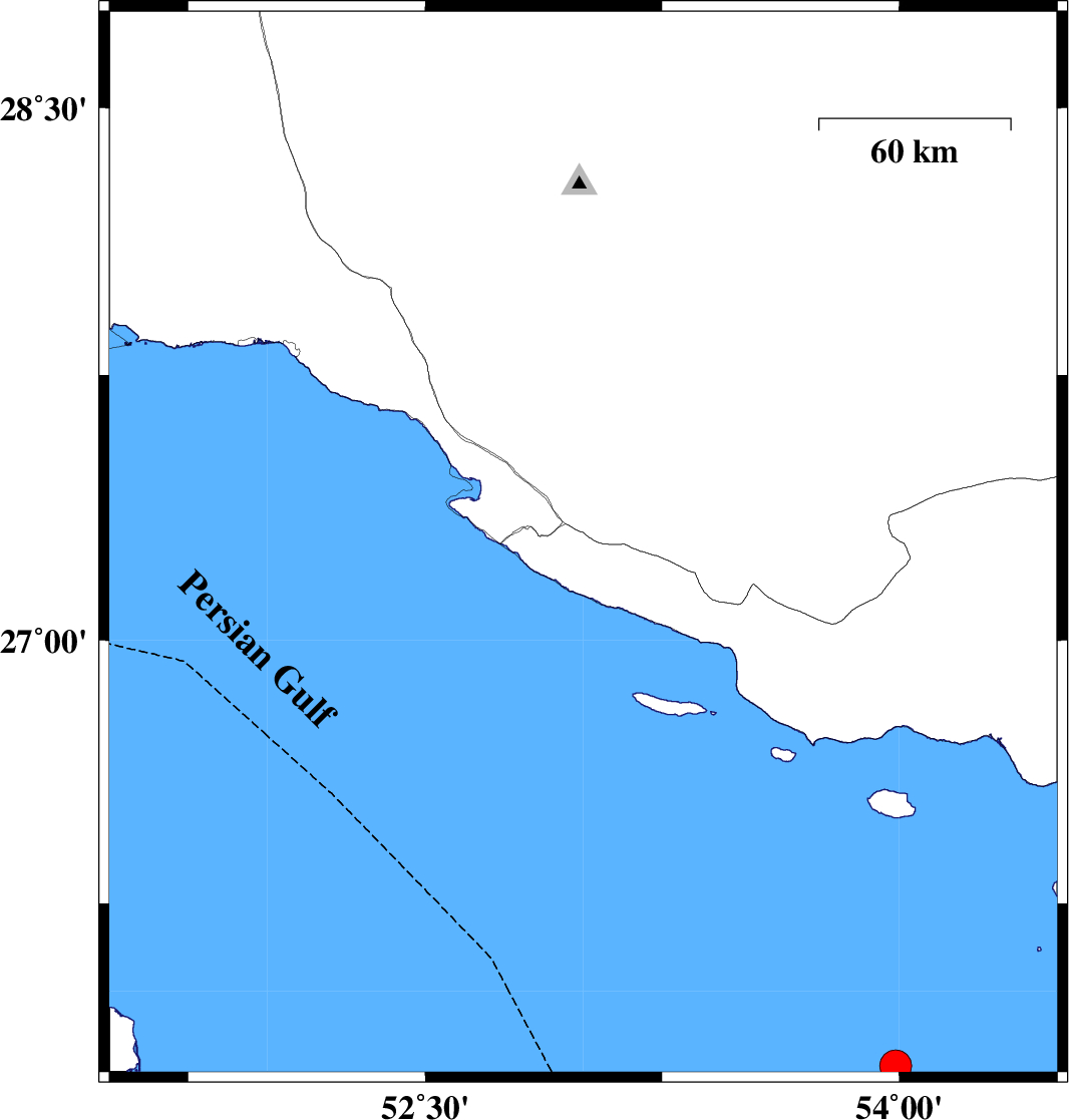 | 2015/04/09 | 02:48:03.1 | 07:18:03.1 | 28.25 | 51.63 | 43 | ML3.6 | Bushehr Province, 51 km South-East of Khormog | ||