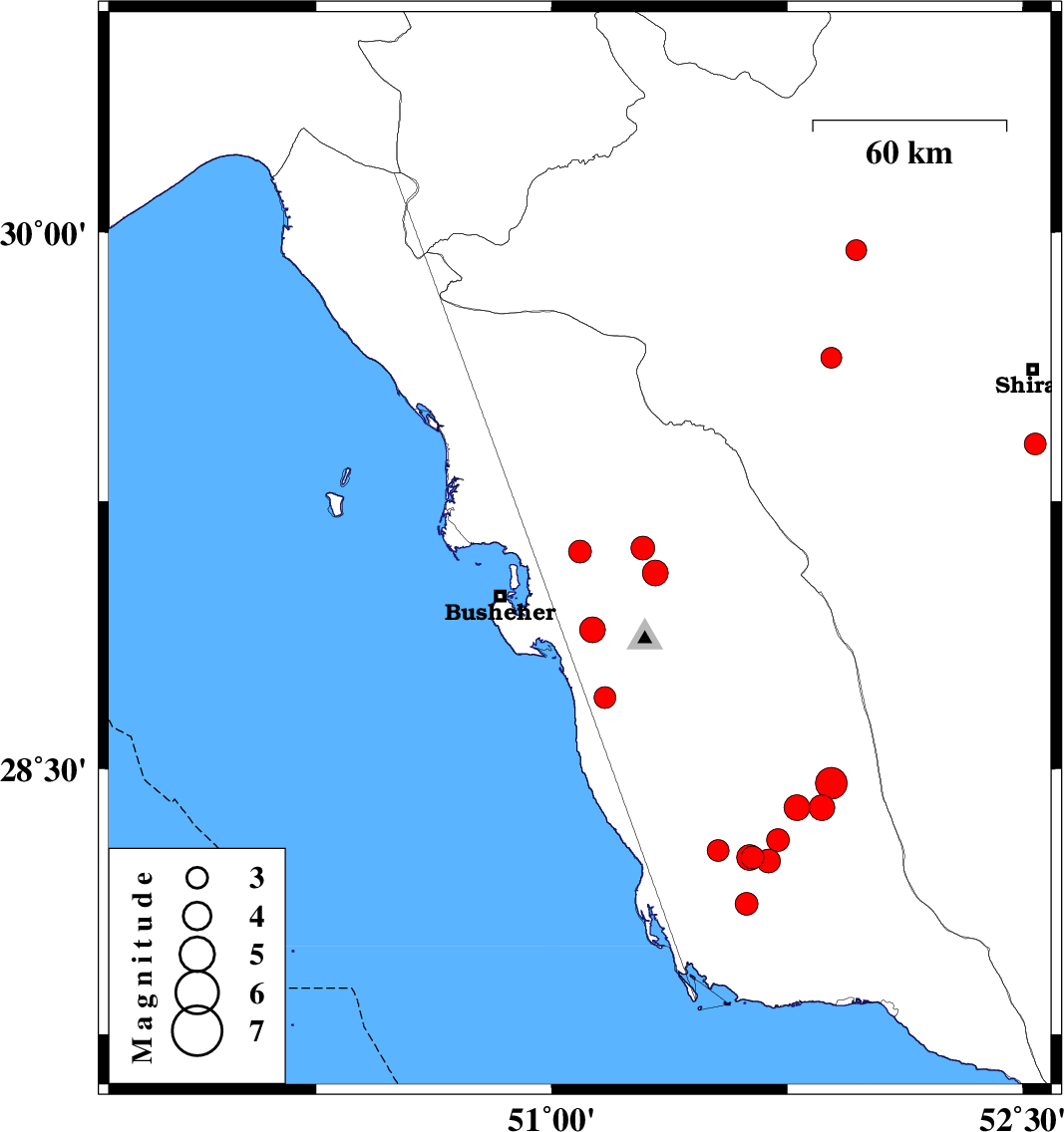 | 2015/04/05 | 05:03:57.7 | 09:33:57.7 | 29.12 | 51.29 | 7 | ML3.4 | Bushehr Province, 18 km South of Borazjan | ||