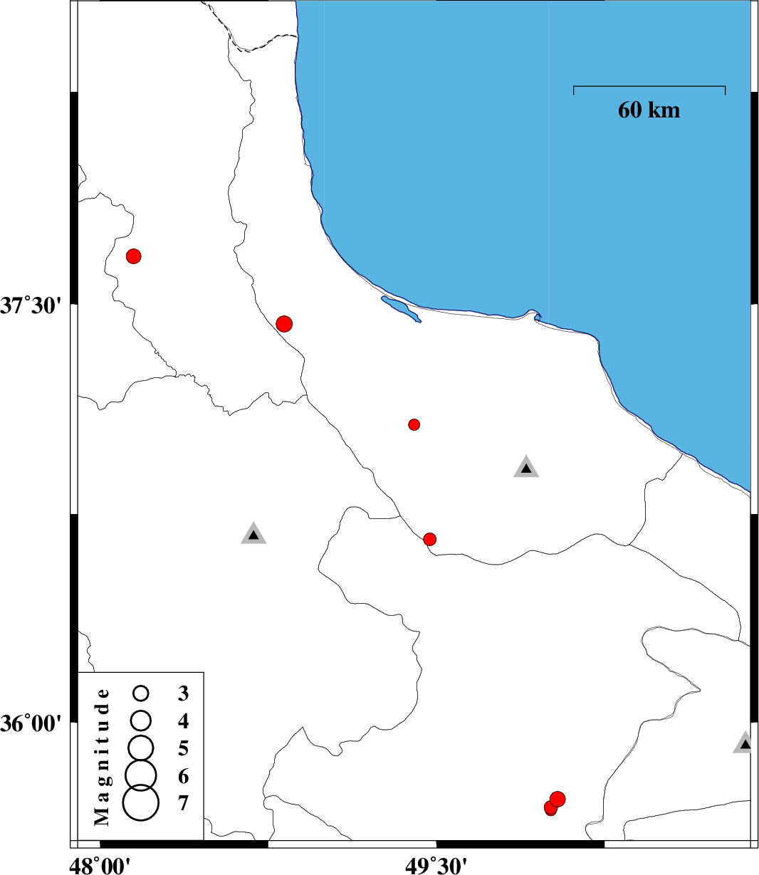 | 2015/04/16 | 01:10:35.2 | 05:40:35.2 | 37.43 | 48.82 | 14 | ML3.3 | Gilan Province, 31 km West of Masal | ||