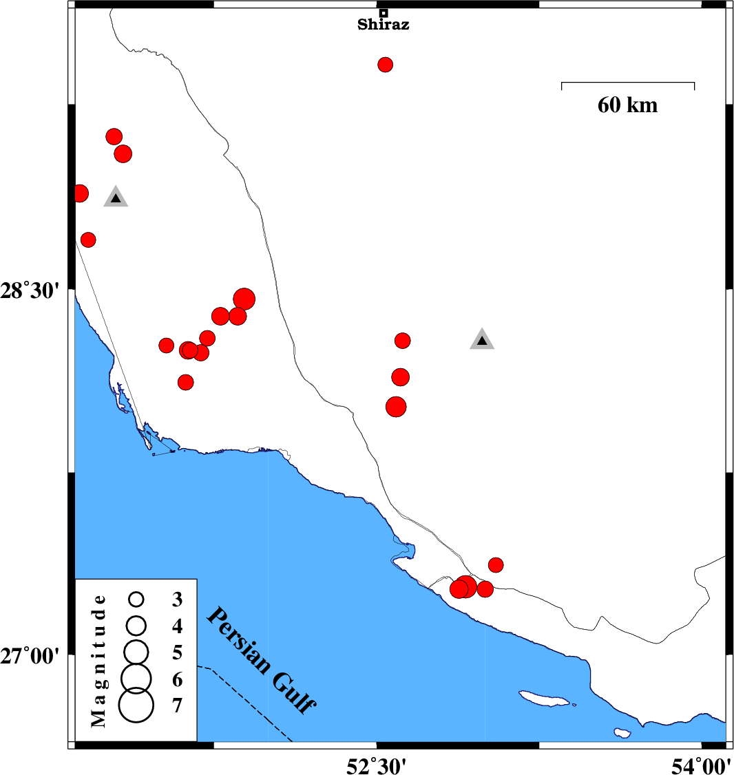| 2015/04/05 | 05:03:57.7 | 09:33:57.7 | 29.12 | 51.29 | 7 | ML3.4 | Bushehr Province, 18 km South of Borazjan | ||