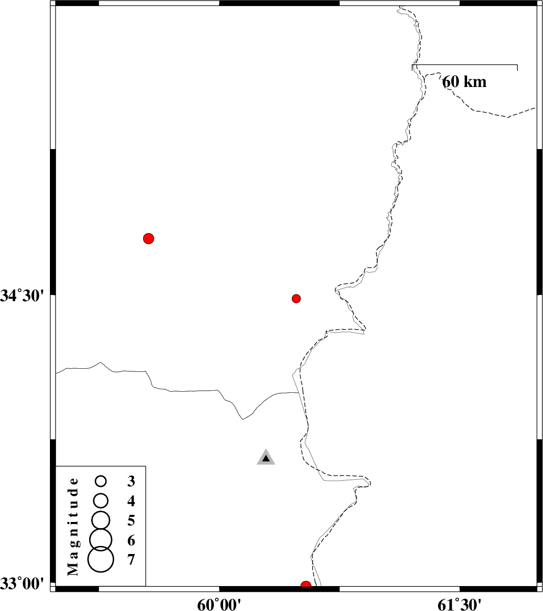 | 2015/04/02 | 21:09:54.3 | 01:39:54.3 | 34.79 | 59.56 | 15 | ML2.9 | Khorasan(center) Province, 58 km North-West of Khaf |