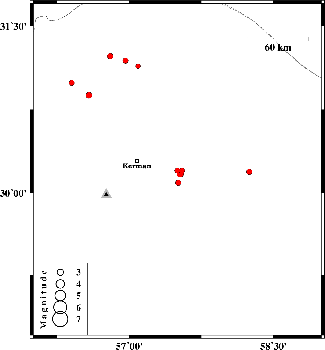 | 2015/03/23 | 20:26:19.0 | 00:56:19.0 | 30.17 | 57.53 | 15 | ML3.1 | Kerman Province, 45 km South-East of Kerman |