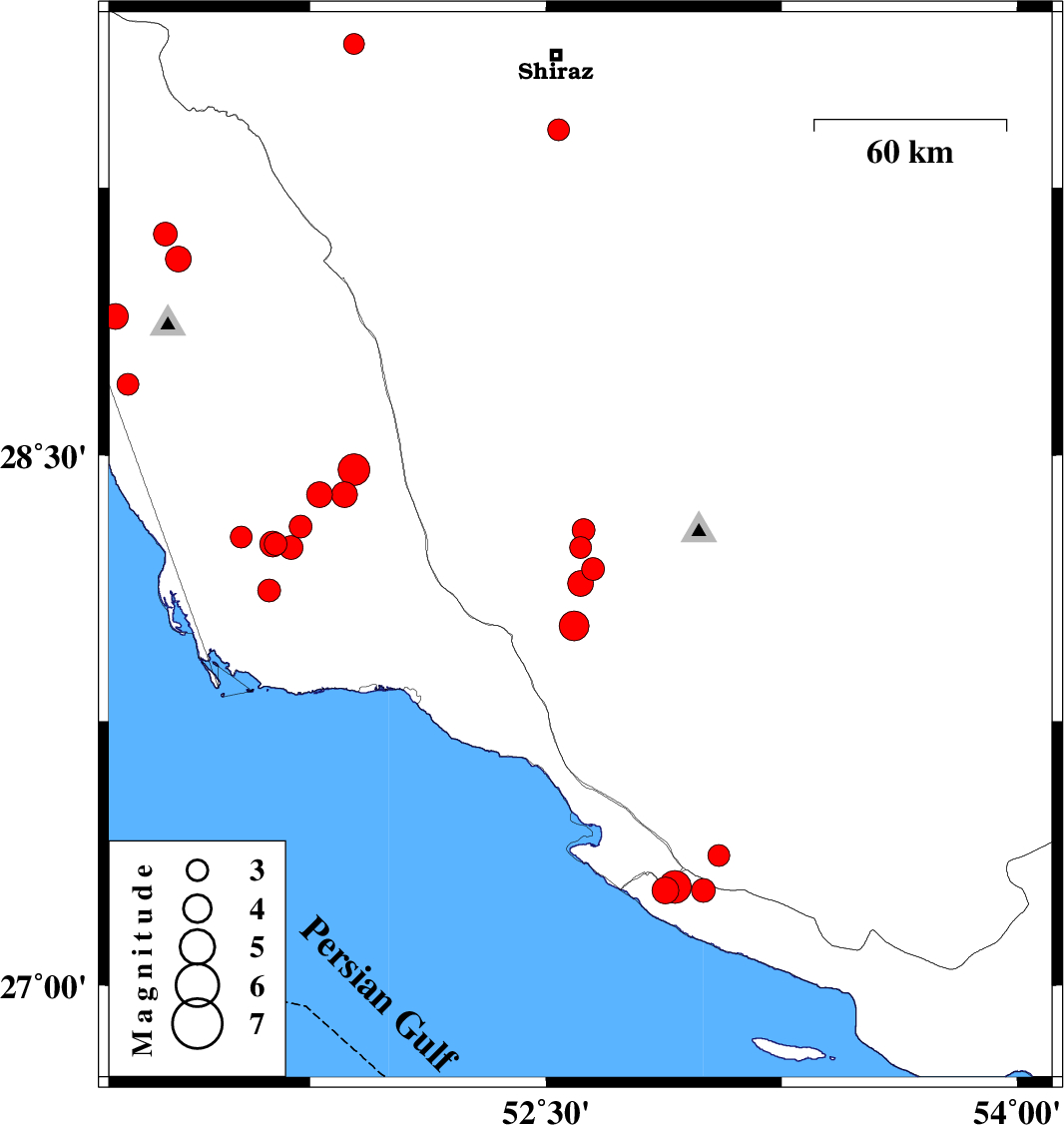 | 2015/04/20 | 09:26:11.8 | 13:56:11.8 | 28.29 | 52.62 | 18 | ML3.3 | Fars Province, 60 km South of Firuz Abad | ||