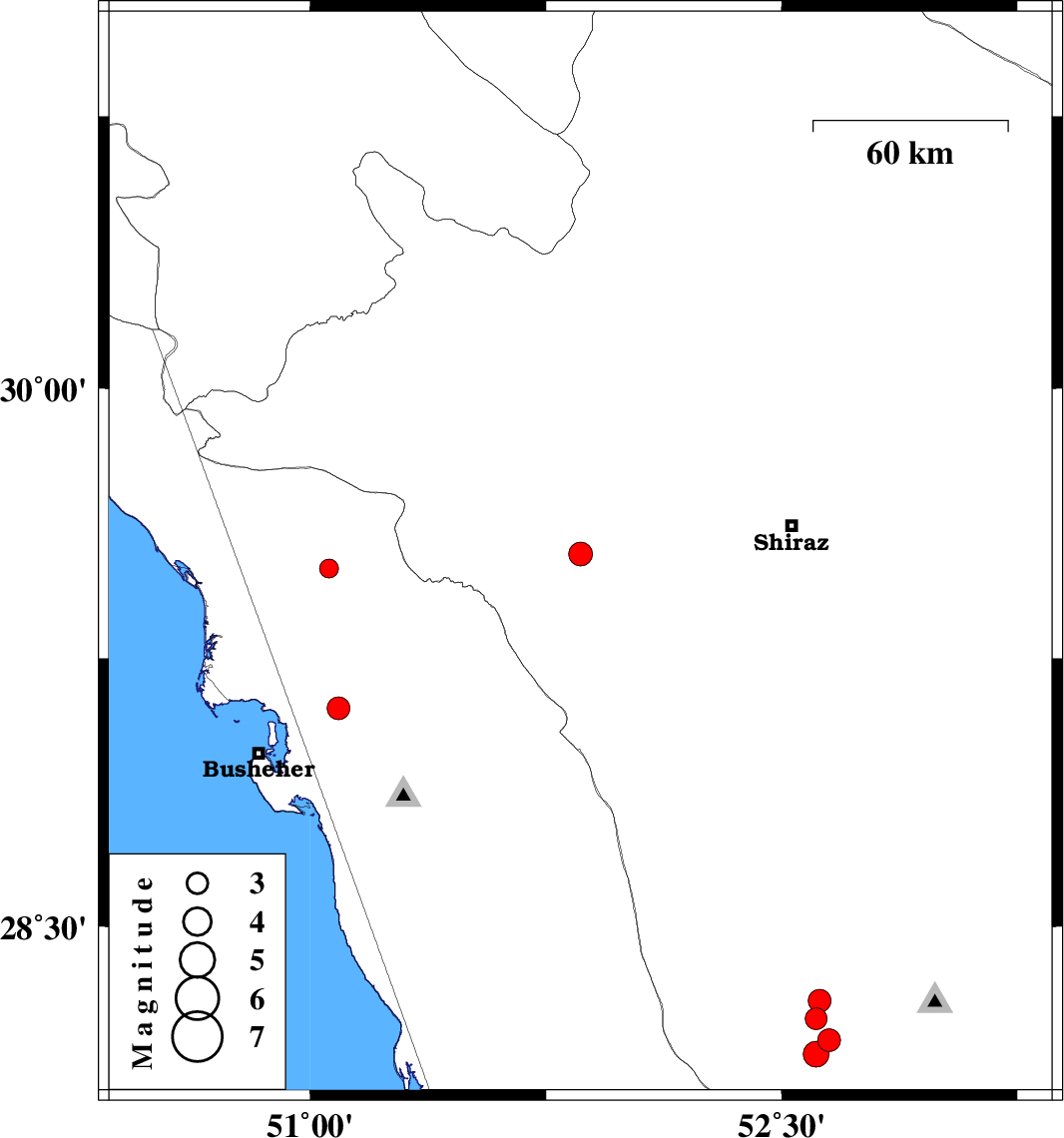 | 2015/04/18 | 23:04:55.3 | 03:34:55.3 | 29.11 | 51.09 | 14 | ML3.3 | Bushehr Province, 20 km South-West of Borazjan |