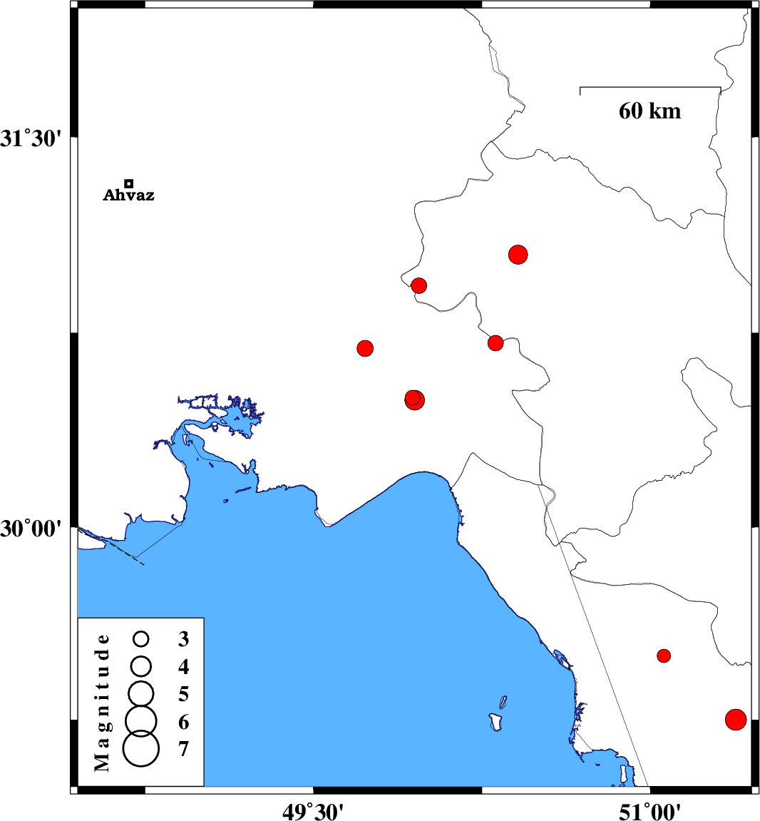| 2015/04/26 | 01:20:46.1 | 05:50:46.1 | 30.5 | 49.94 | 14 | ML3 | Khoozestan Province, 31 km West of Behbahan | ||