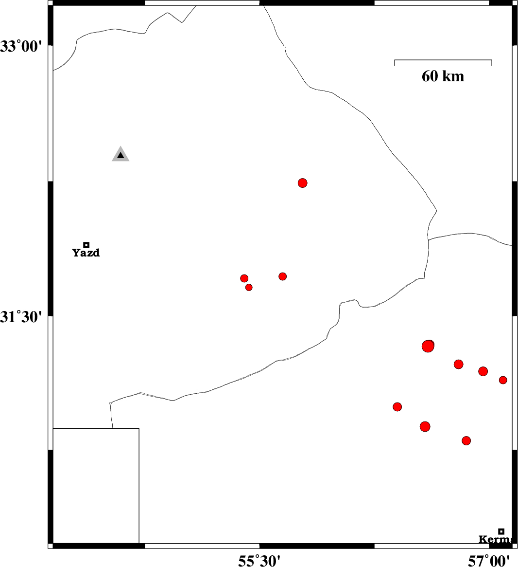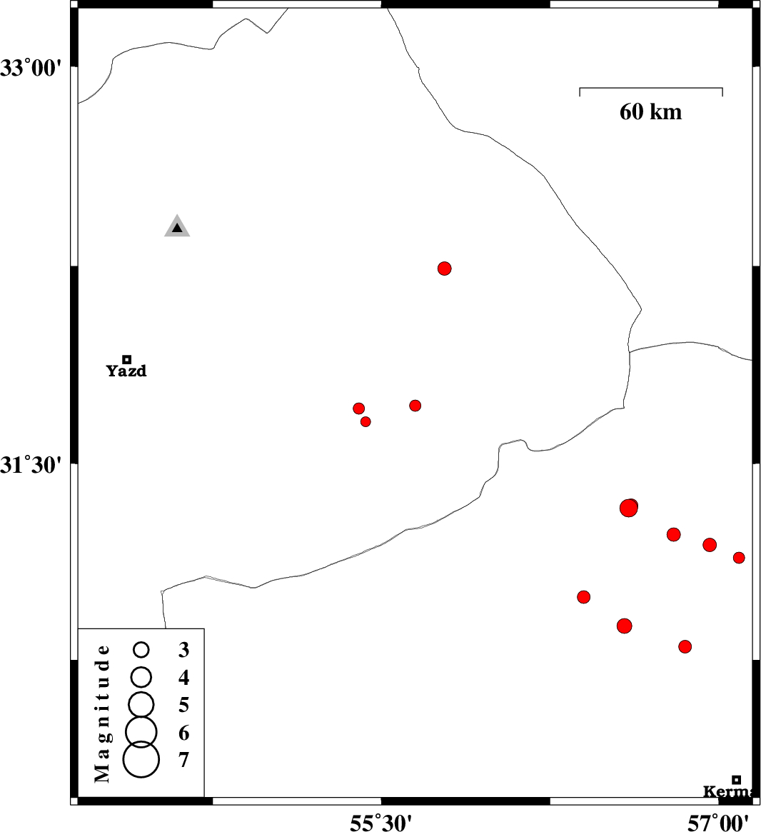 | 2015/05/03 | 08:06:04.5 | 12:36:04.5 | 31.72 | 55.65 | 14 | ML2.2 | Yazd Province, 27 km North-East of Bafq | ||