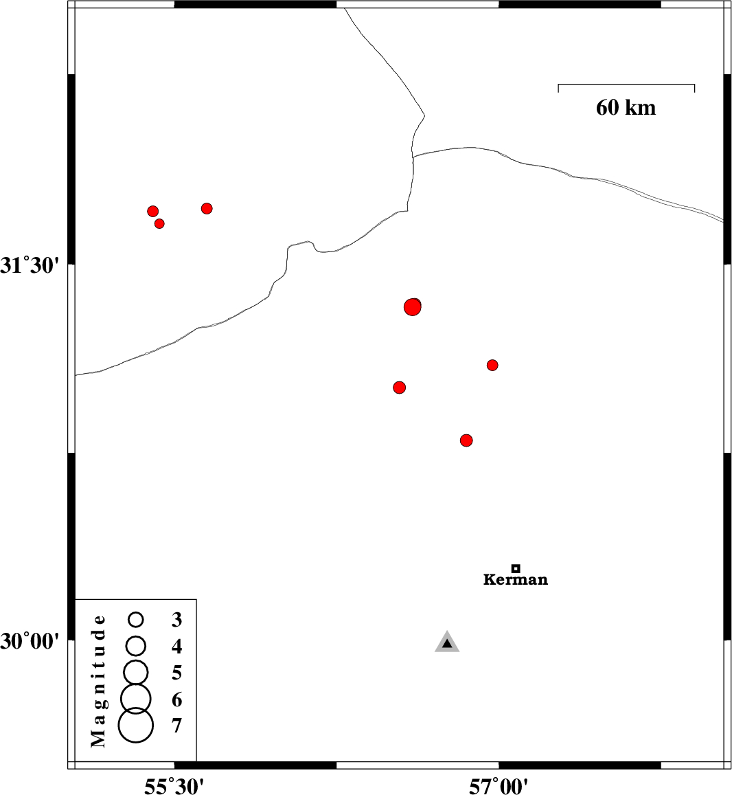 | 2015/05/04 | 03:16:44.8 | 07:46:44.8 | 31.1 | 56.97 | 17 | ML2.2 | Kerman Province, 24 km South-East of Ravar | ||