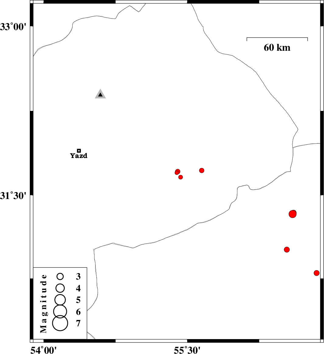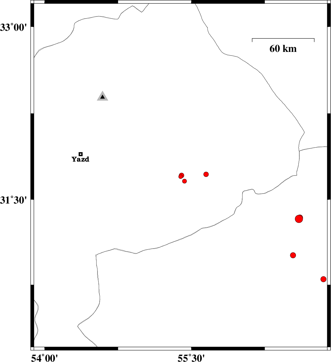 | 2015/05/03 | 08:06:04.5 | 12:36:04.5 | 31.72 | 55.65 | 14 | ML2.2 | Yazd Province, 27 km North-East of Bafq | ||