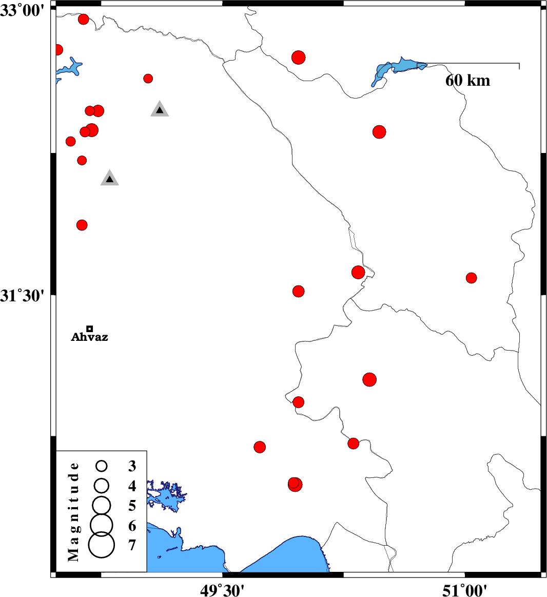 | 2015/04/18 | 23:23:23.2 | 03:53:23.2 | 31.87 | 48.63 | 14 | ML3 | Khoozestan Province, 29 km South-West of Shushtar | ||