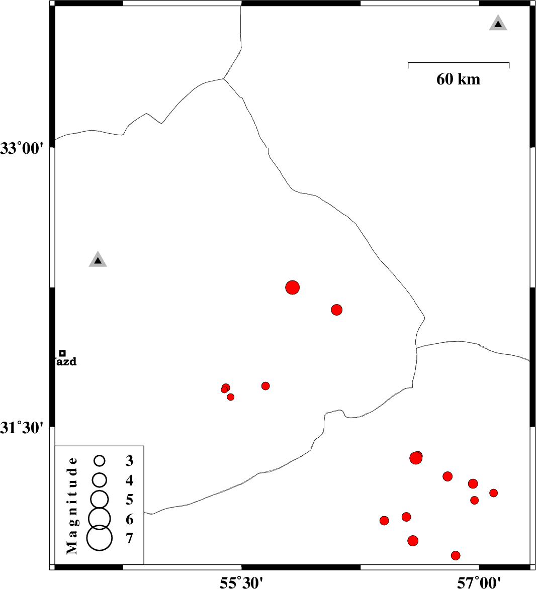 | 2015/05/08 | 03:56:15.2 | 08:26:15.2 | 32.13 | 56.1 | 14 | ML3.1 | Yazd Province, 88 km North-East of Bafq | ||