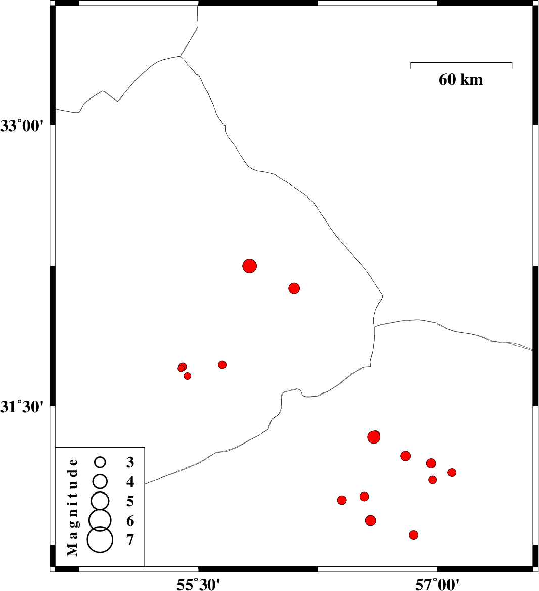 | 2015/04/16 | 23:20:47.3 | 03:50:47.3 | 30.88 | 56.58 | 39 | ML3 | Kerman Province, 8 km Zarand | ||