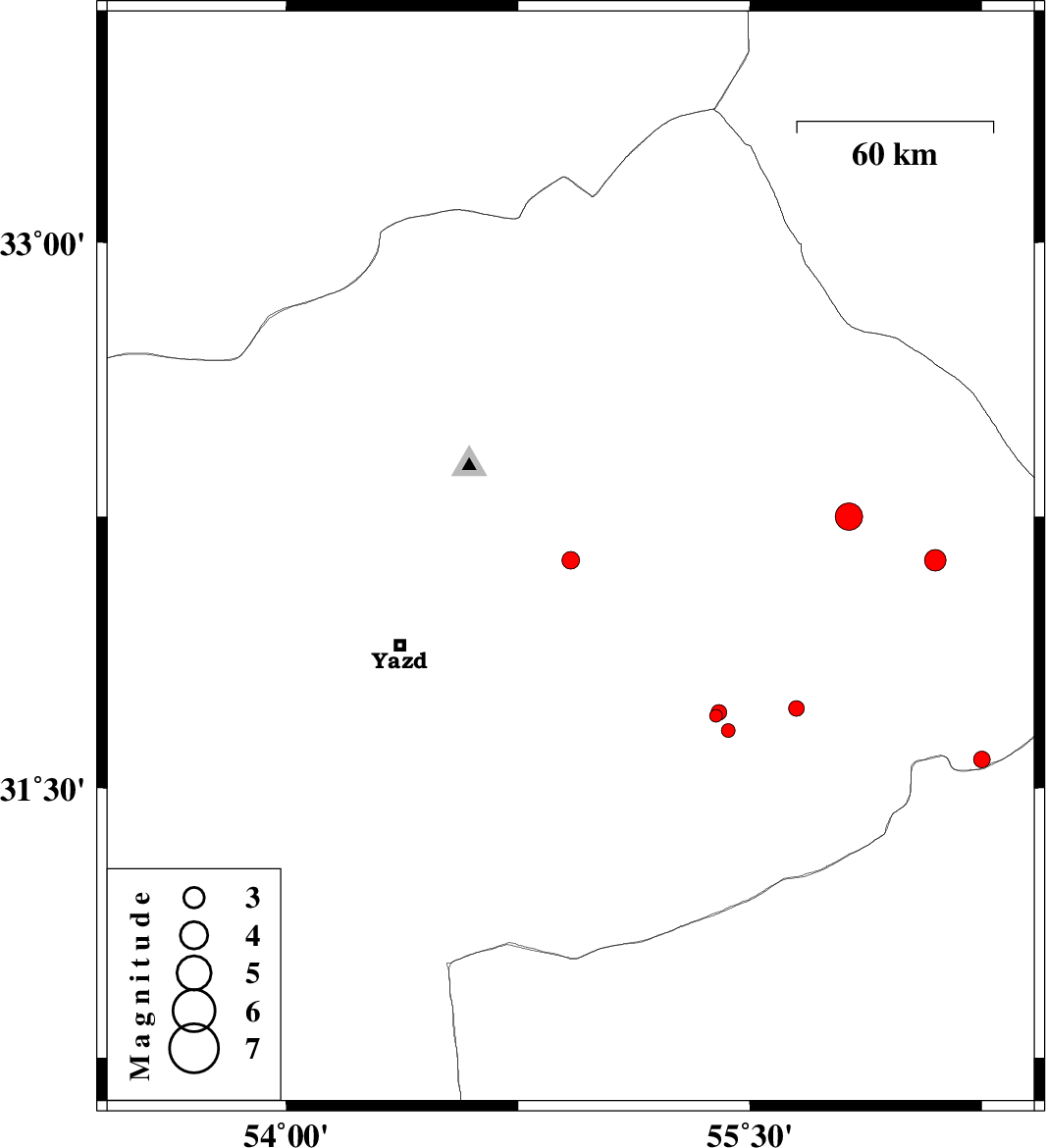 | 2015/05/11 | 05:04:49.3 | 09:34:49.3 | 32.13 | 54.92 | 14 | ML2.5 | Yazd Province, 58 km North-East of Yazd | ||