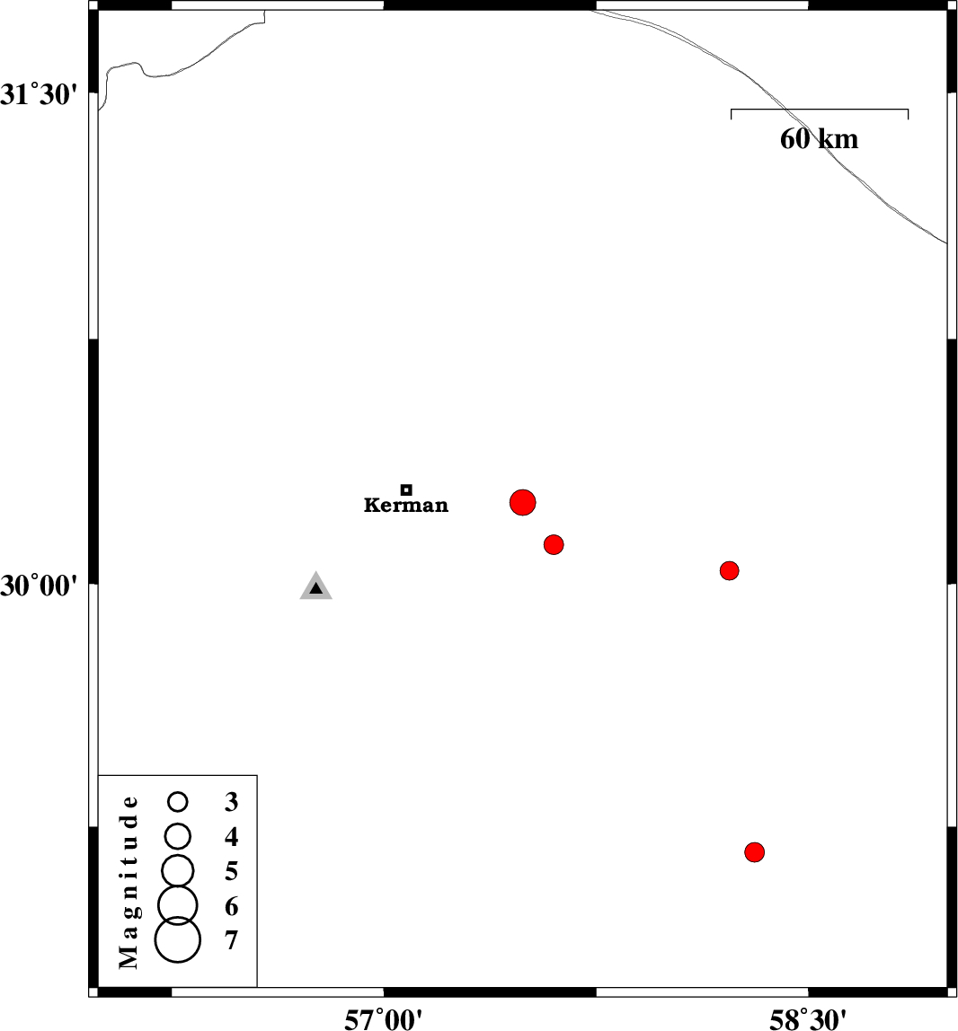 | 2015/05/18 | 11:03:31.3 | 15:33:31.3 | 30.04 | 58.22 | 15 | ML3 | Kerman Province, 105 km North-West of Bam |