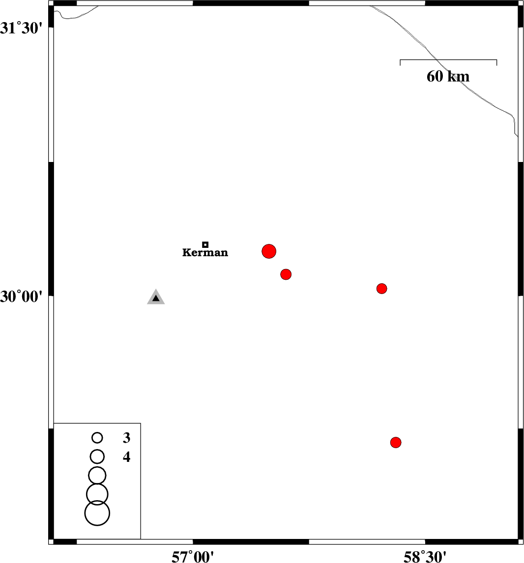 | 2015/05/18 | 11:03:31.3 | 15:33:31.3 | 30.04 | 58.22 | 15 | ML3 | Kerman Province, 105 km North-West of Bam |