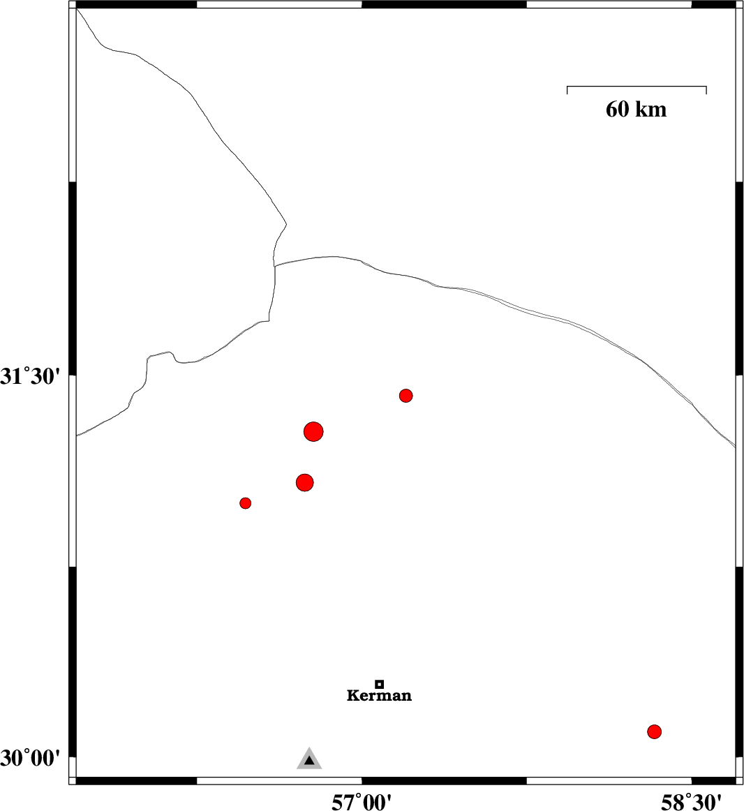 | 2015/05/29 | 07:23:06.4 | 11:53:06.4 | 31.28 | 56.78 | 17 | ML3.9 | Kerman Province, 4 km Ravar | ||