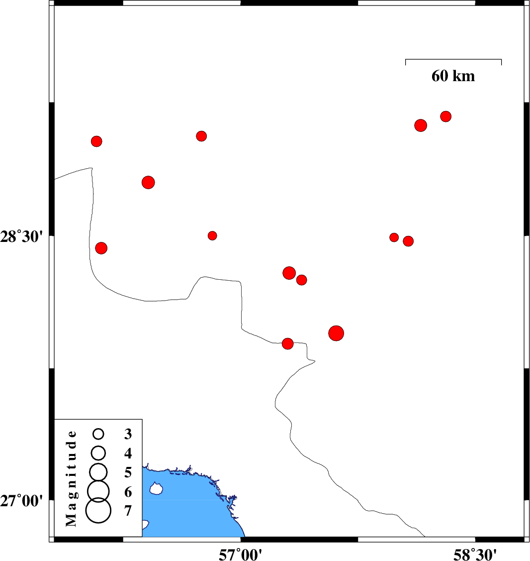 | 2015/05/08 | 03:36:33.3 | 08:06:33.3 | 28.47 | 58.07 | 18 | ML3 | Kerman Province, 39 km South-East of Jiroft |