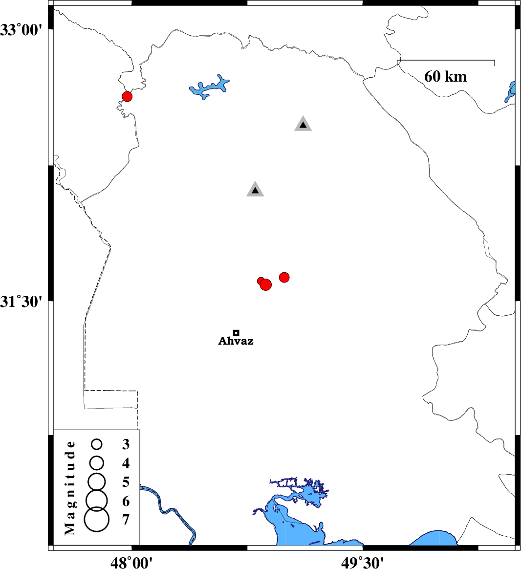 | 2015/06/09 | 03:22:58.5 | 07:52:58.5 | 31.63 | 48.99 | 18 | ML2.9 | Khoozestan Province, 48 km South-East of Shushtar | ||