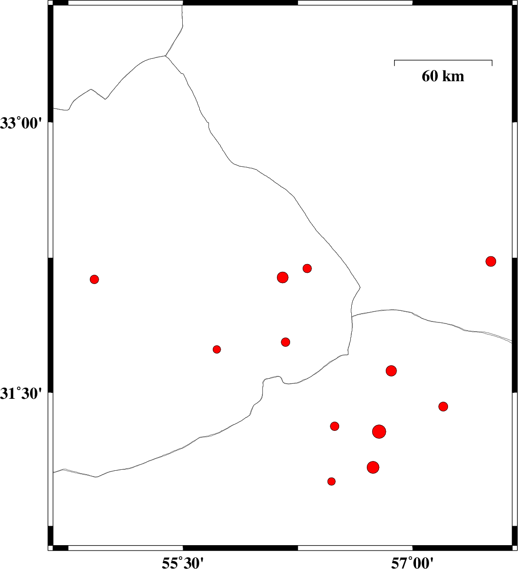| 2015/05/29 | 07:23:06.4 | 11:53:06.4 | 31.28 | 56.78 | 17 | ML3.9 | Kerman Province, 4 km Ravar | ||