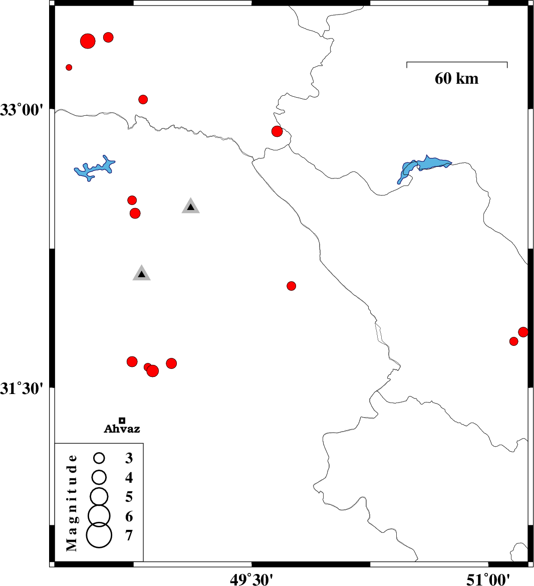 | 2015/06/09 | 03:22:58.5 | 07:52:58.5 | 31.63 | 48.99 | 18 | ML2.9 | Khoozestan Province, 48 km South-East of Shushtar | ||